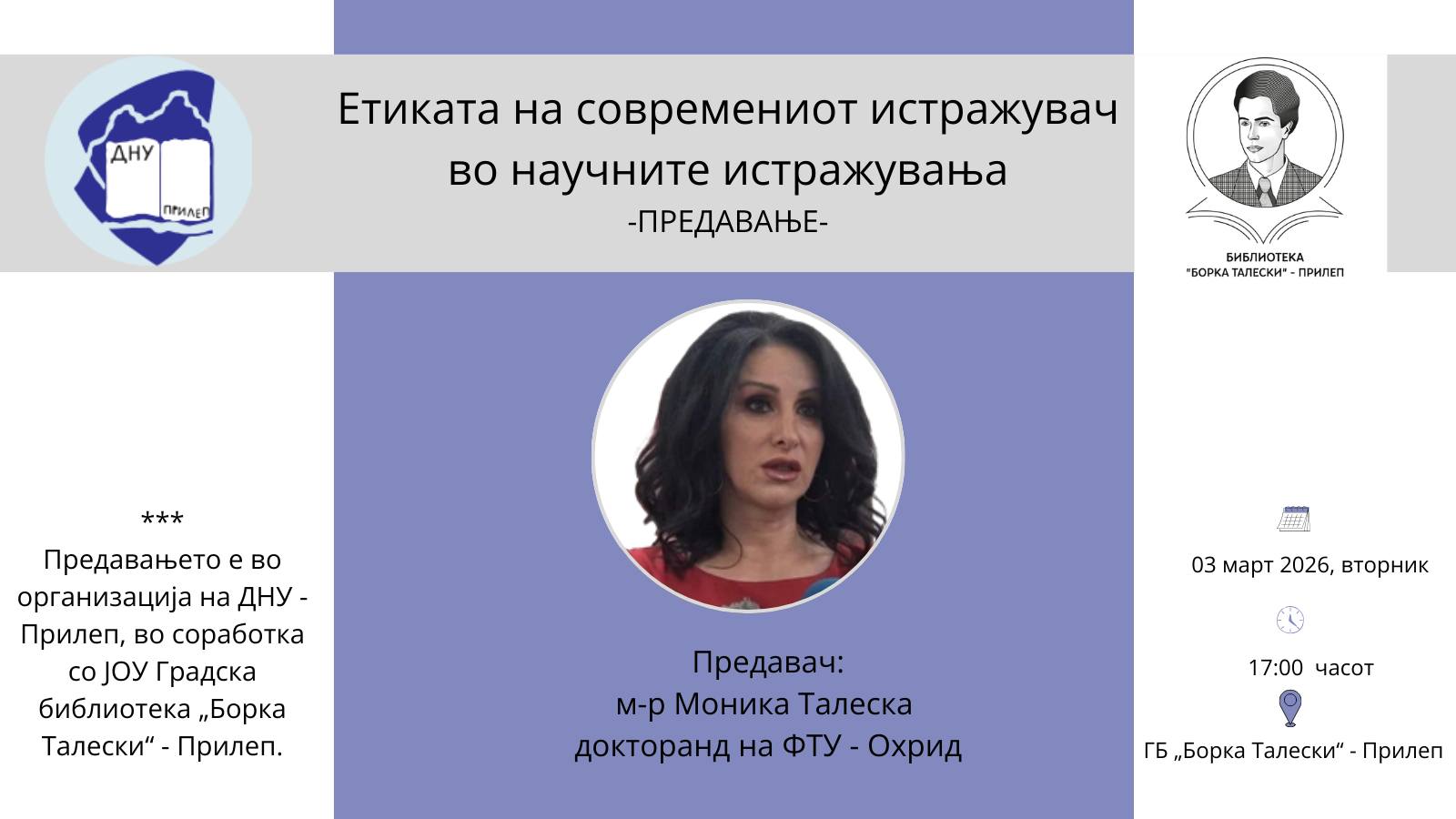 „Етиката на современиот истражувач во научните истражувања“ е темата на академското предавање, што во организација на Друштвото за наука уметност -Прилеп, ќе се одржи на 3 март, 2026 (вторник) во Градската библиотеката „Борка Талески“- Прилеп.